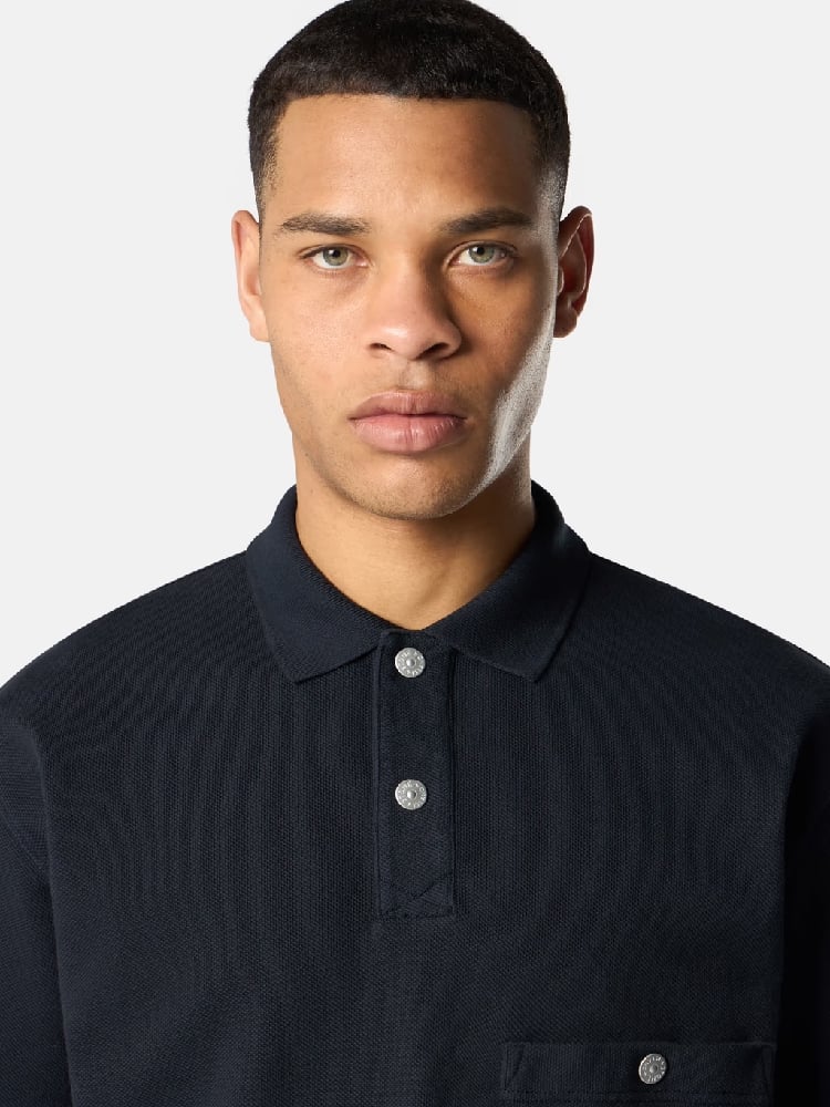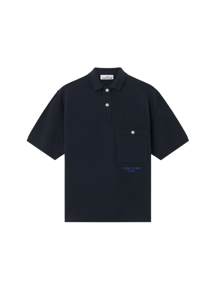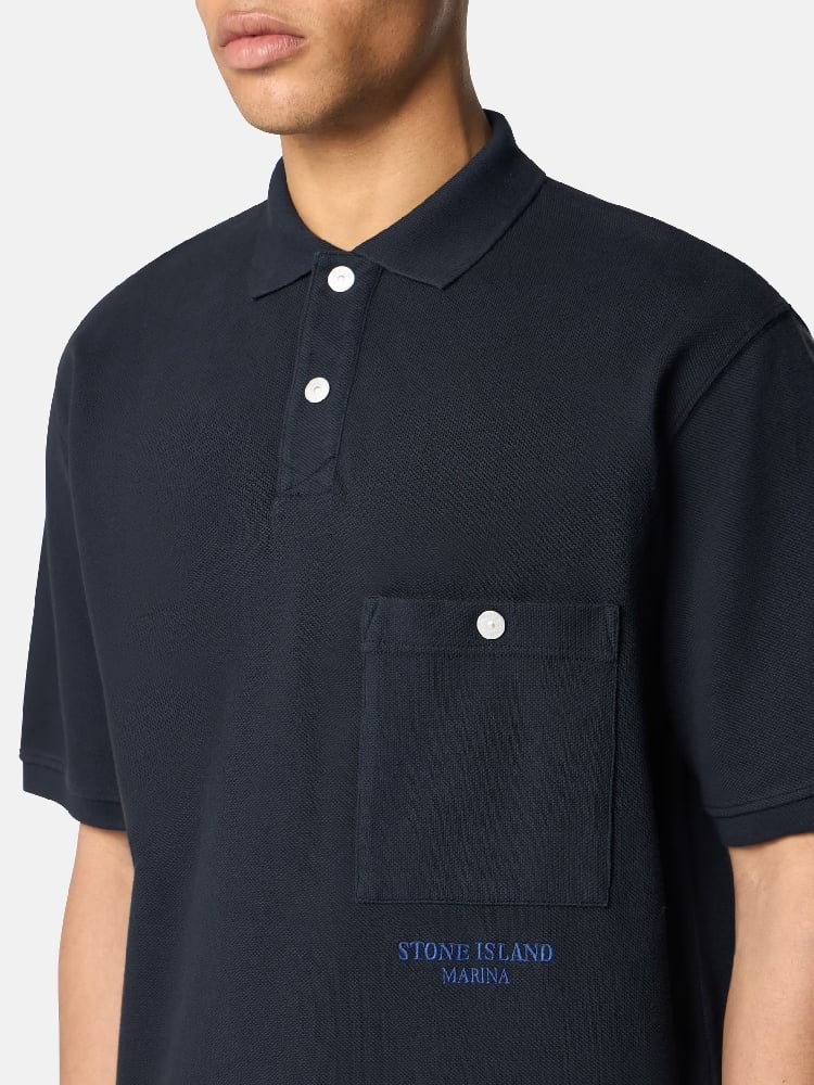 Short-sleeve polo shirt made from organic cotton macro piqué featuring a two-snap neck fastening, chest pocket, and Stone Island Marina embroidery.